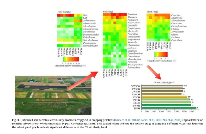輪作是管理農(nóng)業(yè)生態(tài)系統(tǒng)生物多樣性的一種傳統(tǒng)而實(shí)用的方法,可以增強(qiáng)土壤健康,抑制病蟲害爆發(fā),從而提高產(chǎn)量。作物輪作的價(jià)值和效率取決于幾個(gè)因素:作物類型用于旋轉(zhuǎn)、旋轉(zhuǎn)系列和某些作物的應(yīng)用頻率、旋轉(zhuǎn)長度、農(nóng)業(yè)歷史農(nóng)田和土壤特性。這些因素可以在許多方面影響土壤健康。例如,作物輪作可以通過破壞與特定作物或作物基因型相關(guān)的土傳病原體的生命周期,為某些土壤功能微生物的生長提供更好的機(jī)會(huì),限制病害壓力。